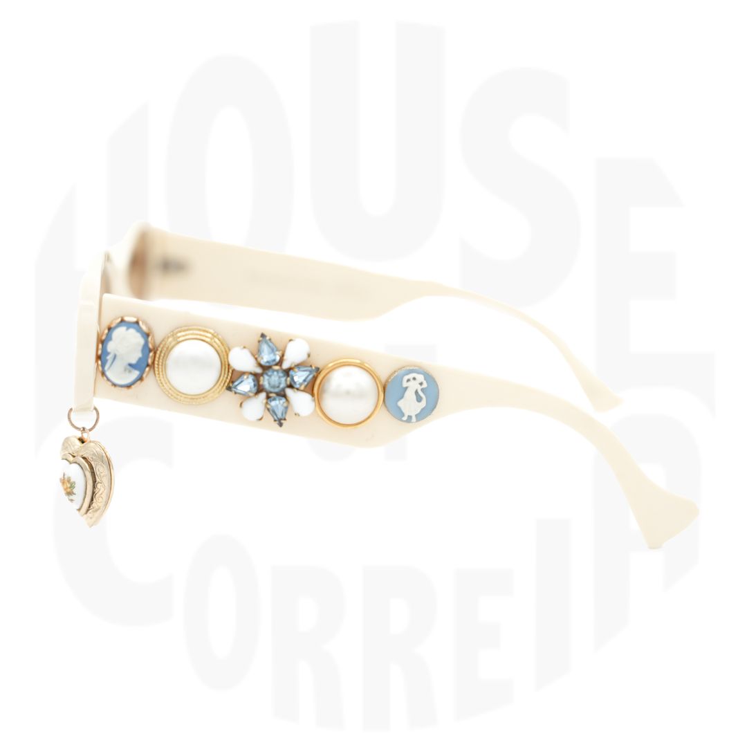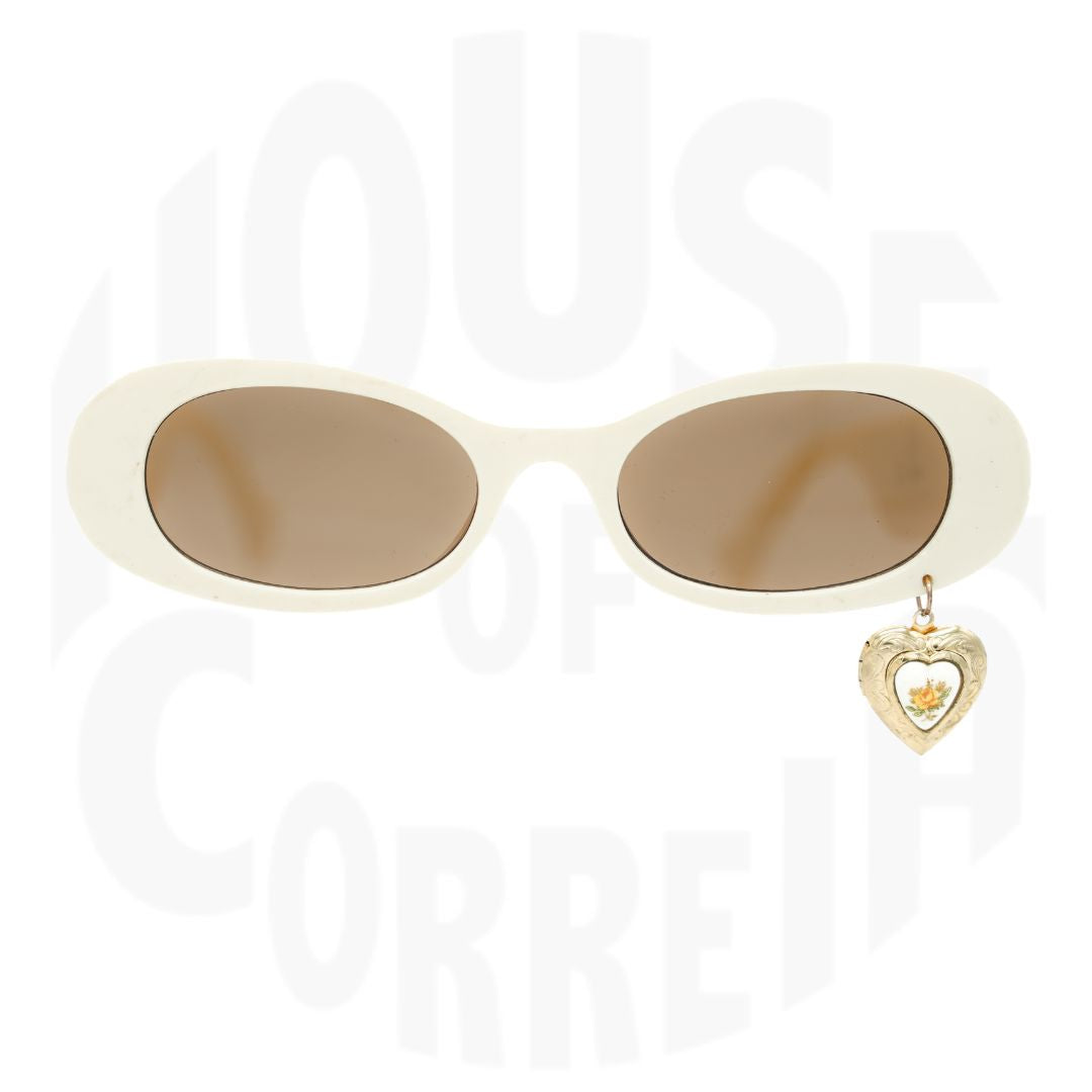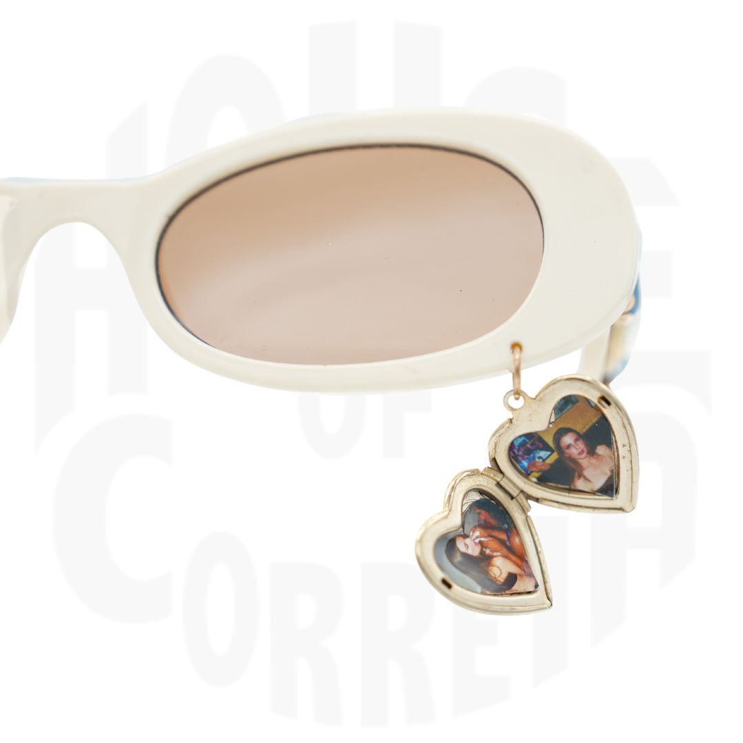 We love the idea of a vintage locket to remember These cream oval frames are adorned with coquette style vintage charms and a dangling locket with a picture of our Mother, Julia Fox.